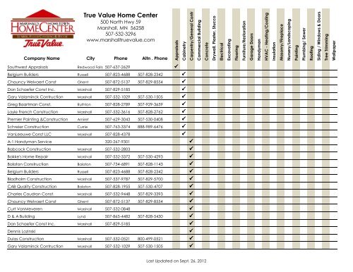 Contrator Web Listing 2012 Xlsx True Value Home Center